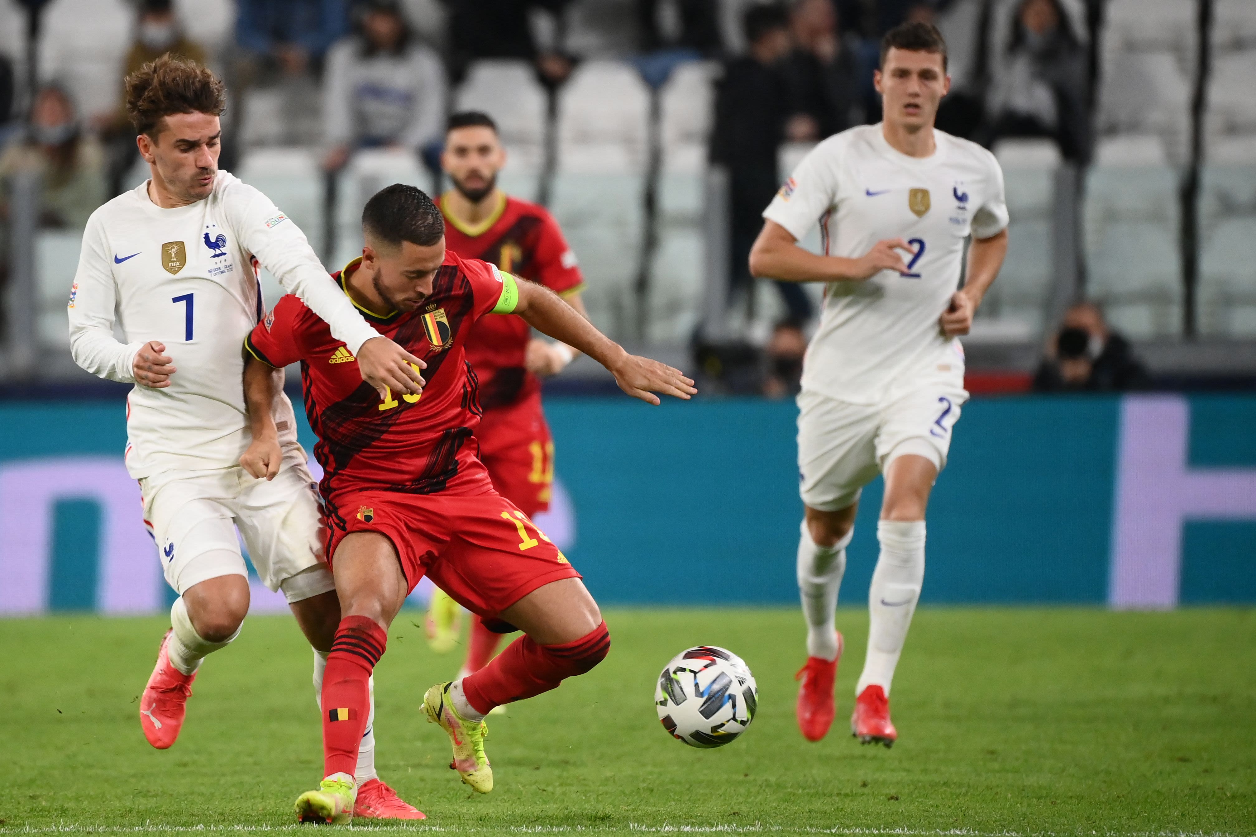 Moins étincelant en attaque, Antoine Griezmann a été précieux dans le repli défensif comme ici face à la Belgique d'Eden Hazard en demi-finale. Photo AFP